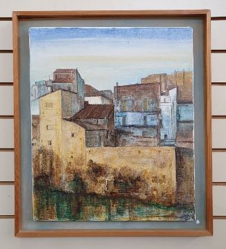Bill Garrad (20th century school)Oil on canvas"River Ebro at Amposta", town scene with river in foreground, signed and dated 89 lower right, 55cm x 36.5cm