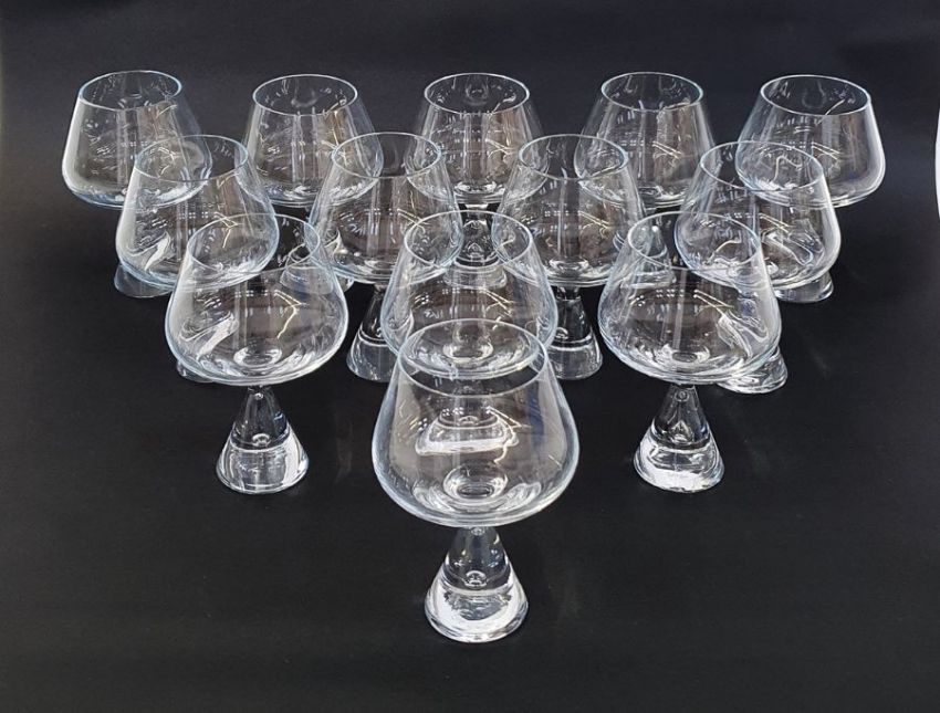 Set of thirteen Holmegaard "Princess" brandy/cognac glasses designed by Bent Severin, the conical foot with an internal air tear rising to the conical flared bowl. (h.12.5cm) (13)