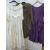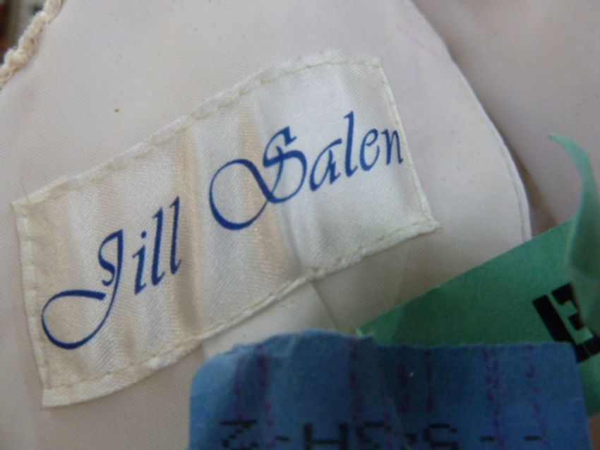 Jill Salen cream, raw silk evening/wedding dress designed with full skirt and stomacher, three-quarter length sleeves trimmed with lace, sequins and faux-pearls, the collar and bodice similar, ribbon detail decoration, hook and eye fastening to the back, a Ann Balon brown crepe cocktail outfit, skirt, cami and long sleeved jacket, embroidered with lace and faux-pearl front button fastening and shoulder pads, the back detailed with lace and a purple satin cocktail dress with drop waist, midi length, bow detail to the left hip, three-quarter length sleeves, scoop neck (3)