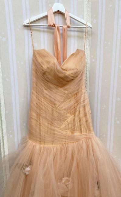 Extravagant apricot net nylon 'Prom' dress and a equally extravagant orange prom-style dress, with a net headpiece and faux flowers (2)