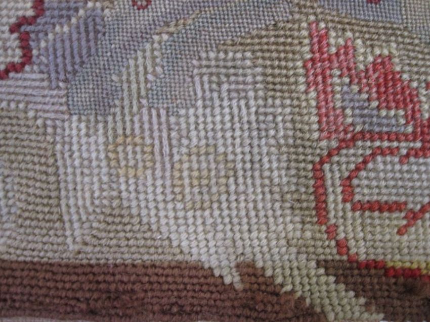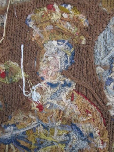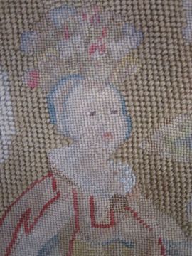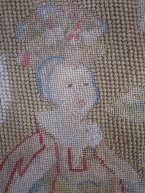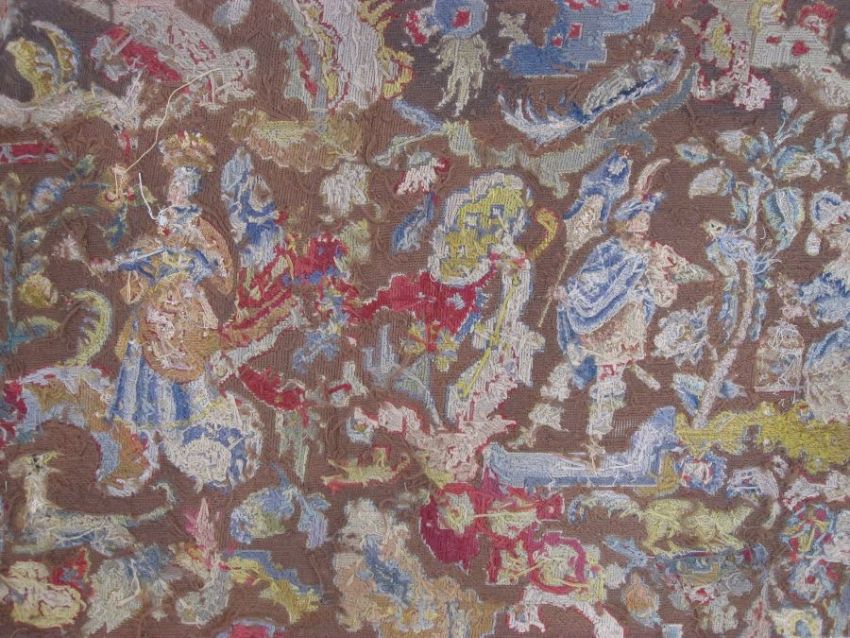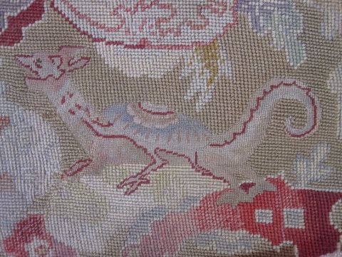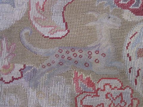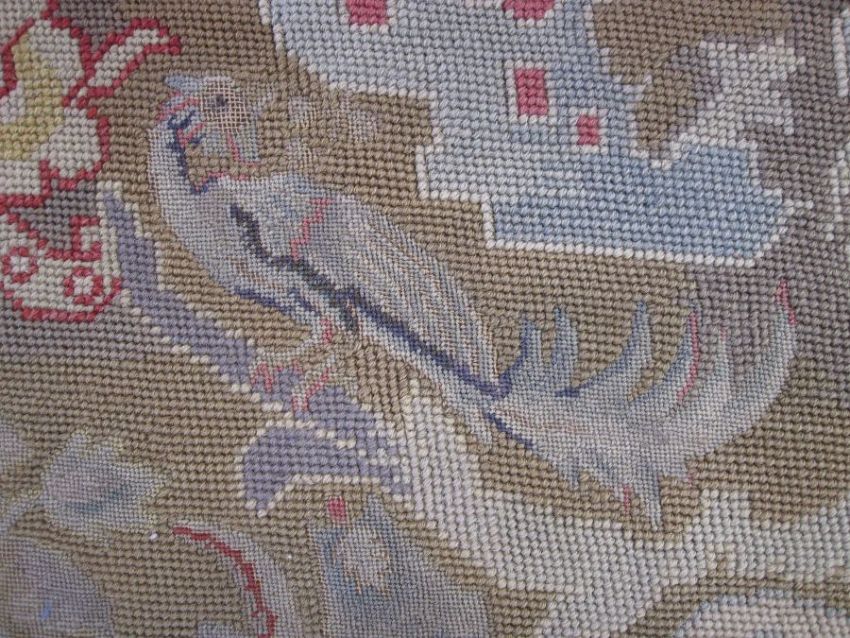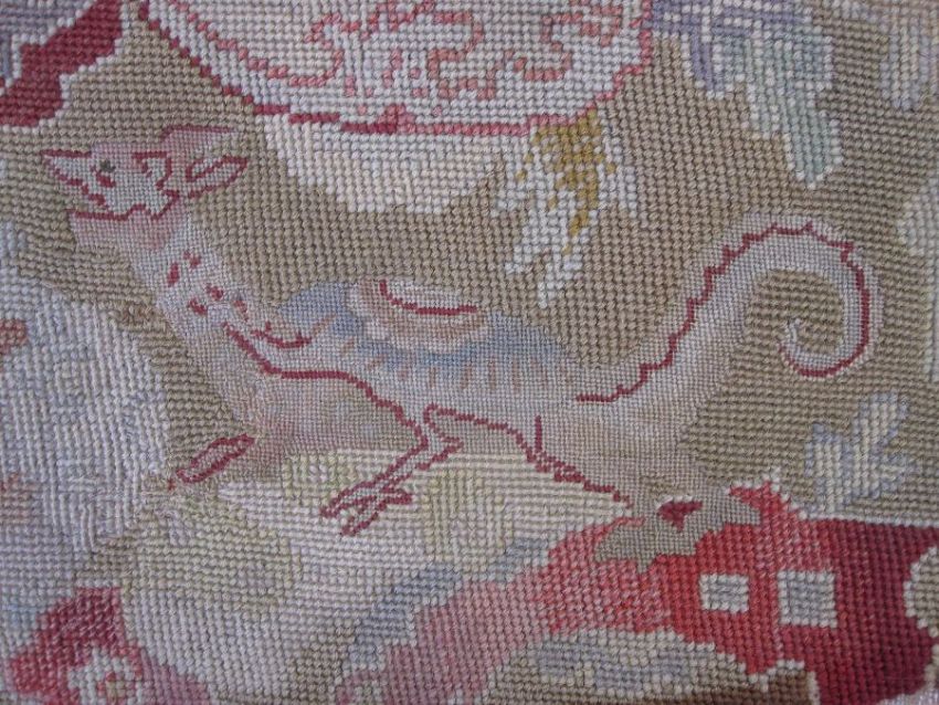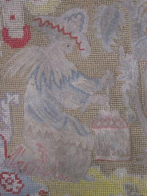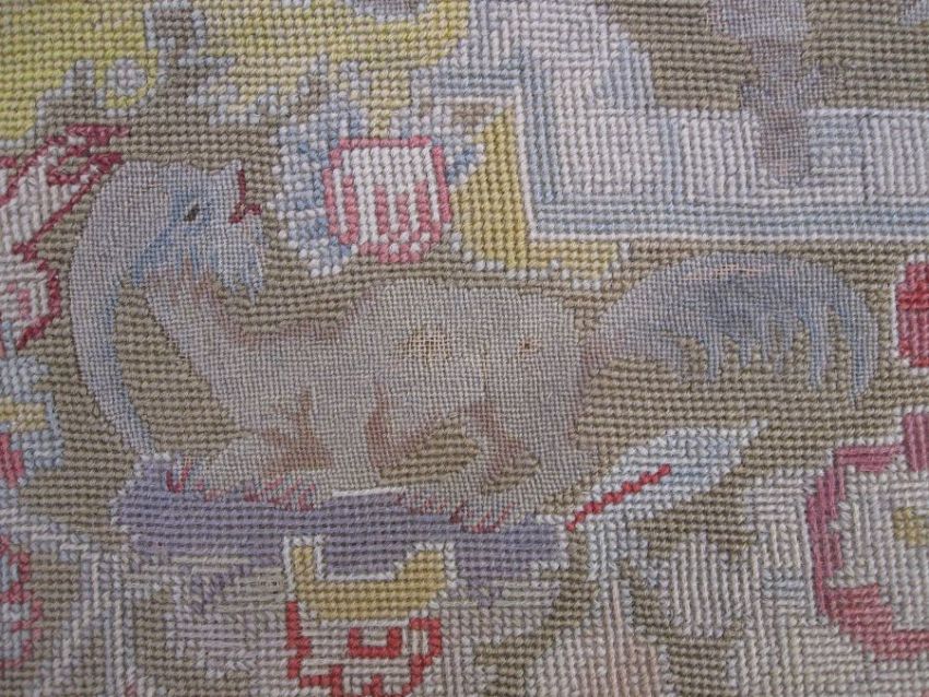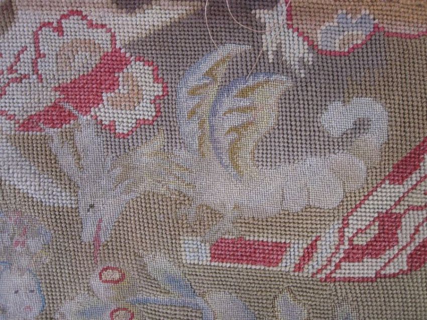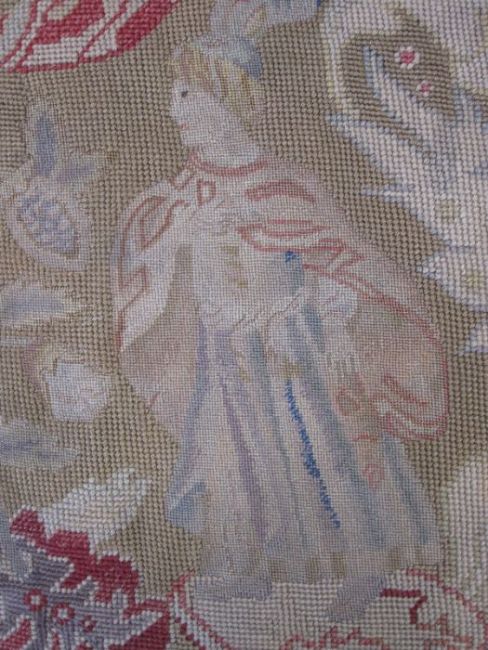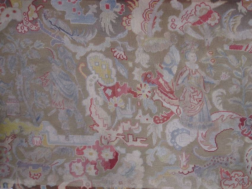Mid-18th century antique needlepoint settee cover, depicting a noble lady and gentleman with two merchants, animals and birds (some possibly mythical creatures) and surrounded by foliate and floral decorative embellishments in yellow, blues, reds, greens and browns (faded commensurate with age), approx 142 x 60cm.