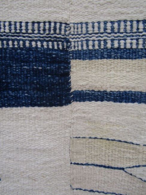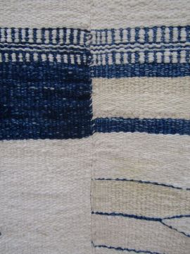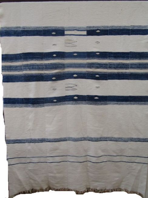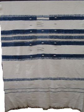 Two vintage African handwoven Malian Fulani striped cotton cloth covers, both hand-stitched in seven panels, one in blue and cream, approx  220cm x 122cm, the other in blue, red and cream, approx 230cm x 122cm, together with a smaller cloth mat, hand-stitched in three panels, approx 110cm x 52cm (some damage) and a single panel (4)
