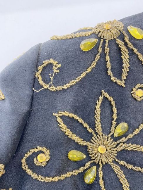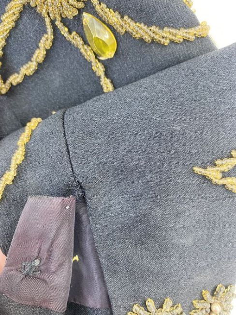 Lacking occasional stone, with others loosening (see photographs). The odd mark and staining to the back. Thread to the right lapel loosening, as well as to threads of the right arm. Wear to the left sleeve.