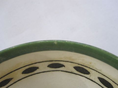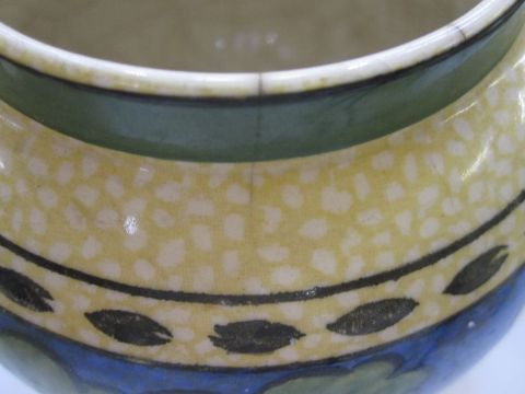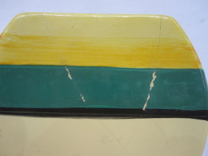 Clarice Cliff honeypot, beehive shape painted with red roof house and landscape, 8.5cm high, Booth's 'Countryside' pattern solitaire part tea set to include teapot, cup, saucer and tea plate, sugar basin, Lawleys Edna Best cream jug and sugar basin (damage), Clarice Cliff banded jug and Price Bros preserve pot (10)Condition ReportPlease see additional imagesDamage to several items and some general ware, crazing, imperfections and scratches/loss of paint; honey pot has a chip to the lid, tea plate and saucer have nibbles to the base rim (possibly in glaze), the tea pot has visible chips to the spout and hairline cracks to the top rim and lid, the sugar bowl has chips to the top rim, the small cream jug has a chip by the handle and the sugar basin has hairline cracks