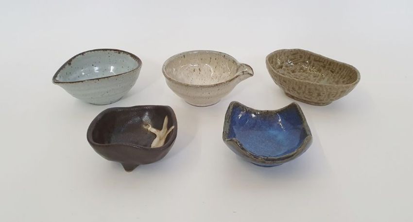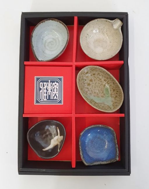 Five Tajimi Japan pottery bowls with original box