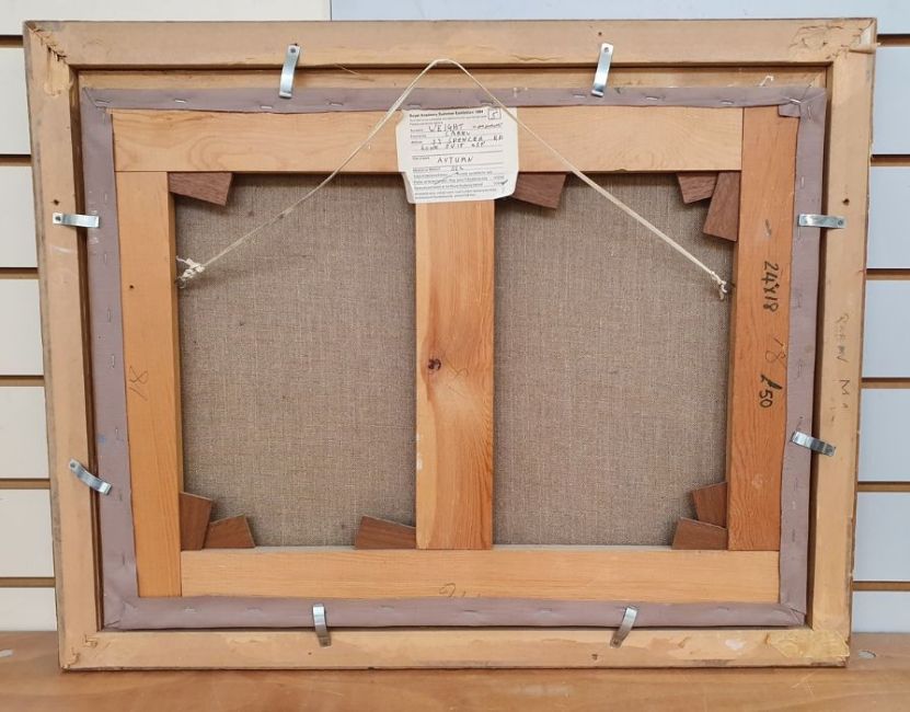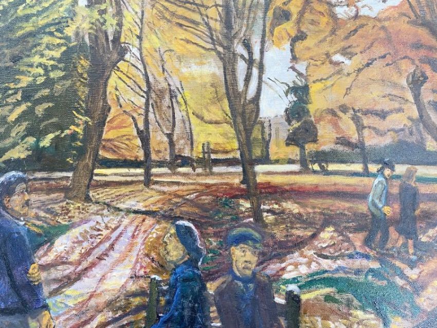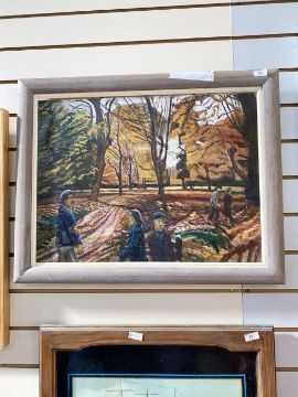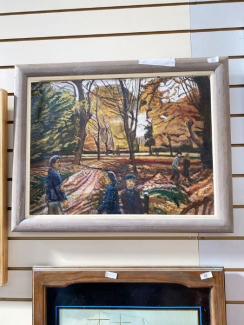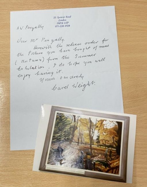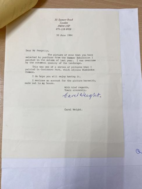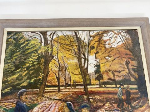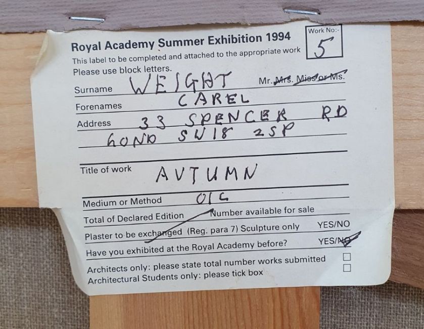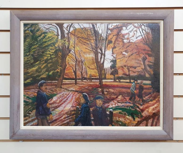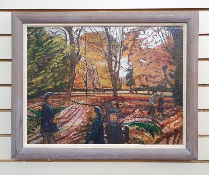 Carel Weight CH CBE RA (1908-1997)Oil on canvas "Autumn", figures in a park, signed top left, bears Royal Academy Summer Exhibition 1994 label verso, 46cm x 61cm and comes with original sale receipt from Royal Academy Summer Exhibition 1994 and a signed letter of correspondence form the artist to the purchaser.Condition ReportFrame is a little chipped to the corners of the verso, with general wear to the edges. Painting is bright; see photographs for condition.
