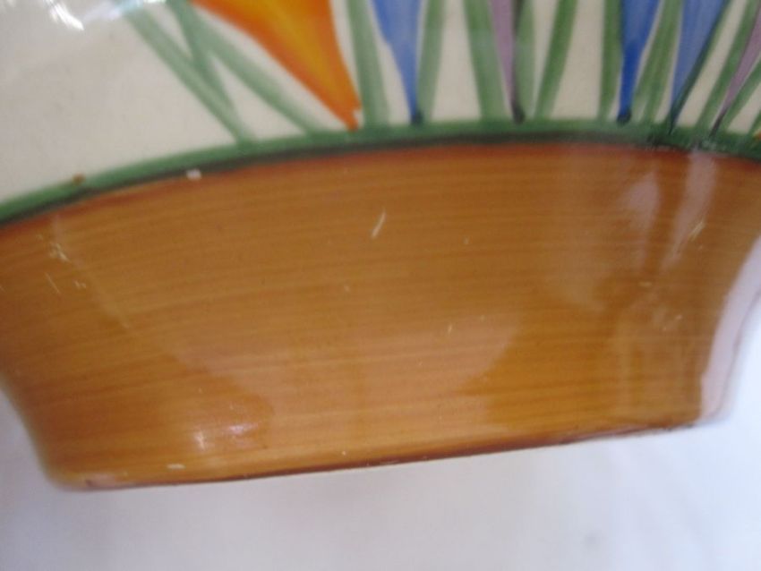 Quantity of Clarice Cliff 'Autumn Crocus' pattern to include bowl 20.5cm diameter, cylindrical jam pot, small bowl 13cm diameter, small cylindrical vase 9.5cm high (4)Condition ReportPlease see additional imagesSome general ware, imperfections to glaze (some possible chips may be under the glaze, particularly to the top and base rims) and scratches/loss of paint: jam pot lid has a chip to underside
