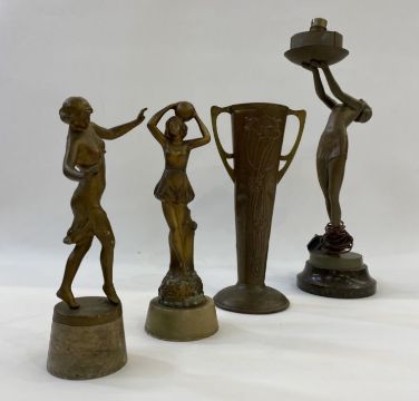 Art Deco-style table lamp the body in the form of a lady bearing charger, on socle base, two further Art Deco bronze-style figures and a copper embossed Art Nouveau style twin-handled vase (4) Condition ReportThis is not of the highest quality, the base is fair, the bulb fixing stuck in with blue tack, and rewiring would be required