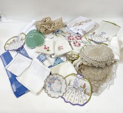 Large quantity of table linen, to include embroidered, damask, crochet bordered, handtowels, etc. ( 1 box)