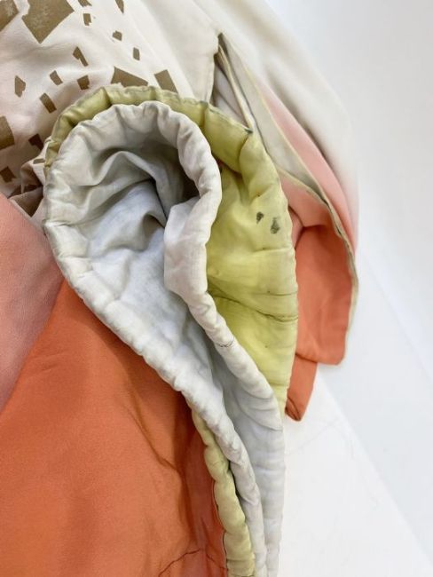 Hem a little worn and faded. The odd mark to the silk, with slight occasional fading of gold squares as per photographs. Patch of the apricot bottom faded as photographed. Left armpit a little stained; slight occasional fraying to the threads.