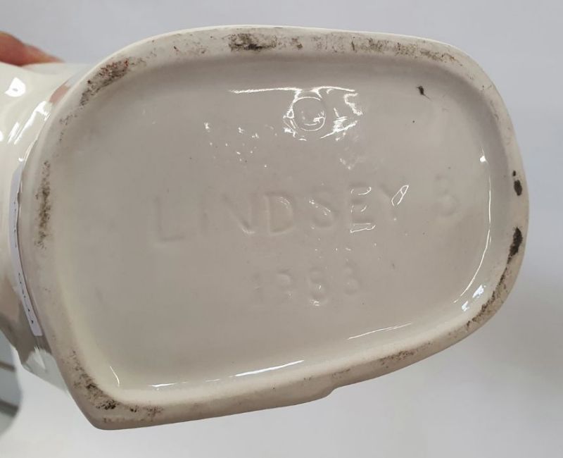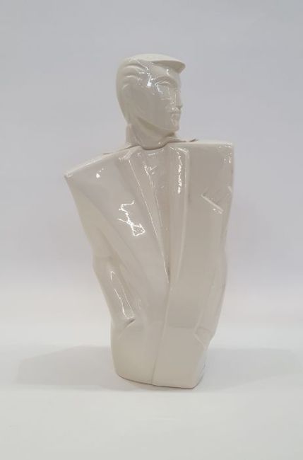 Lindsey Balkweill (British contemporary) porcelain vessel in the form of a male torso wearing suit with removeable head as a lid, white glaze with impressed marks to base and dated 1983 (h.43cm), together with porcelain wall hanging male bust in the style of Lindsey Balkweill, unsigned. (h.33cm) (2)