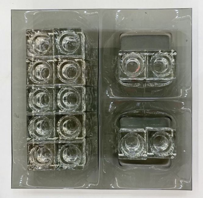 Set of four Pukeberg glass tealight holders together with assorted candle holders to include clear glass slab with raised column design, etc (6)