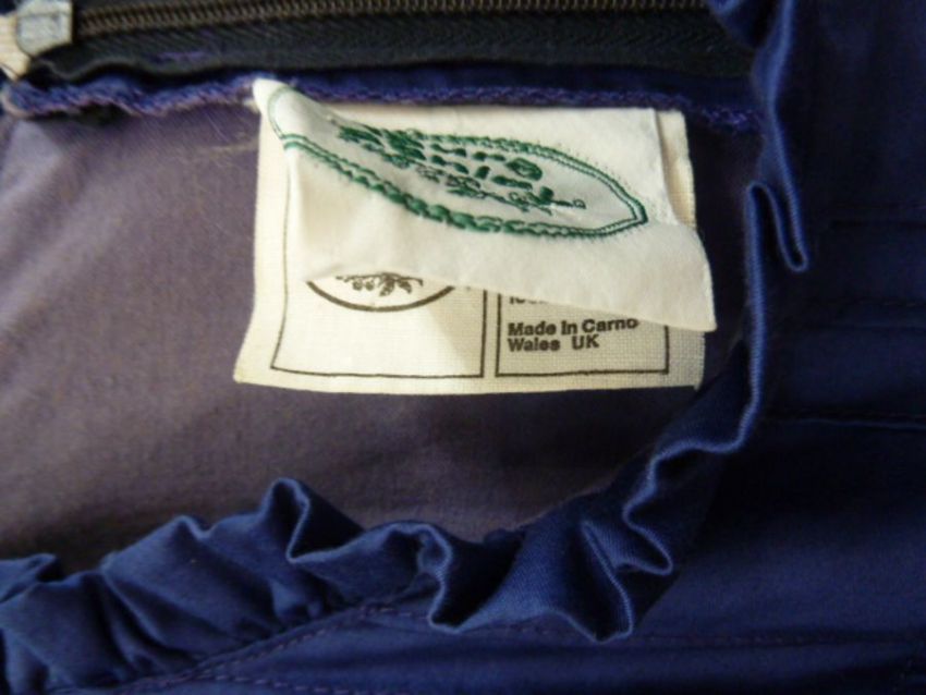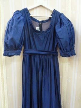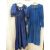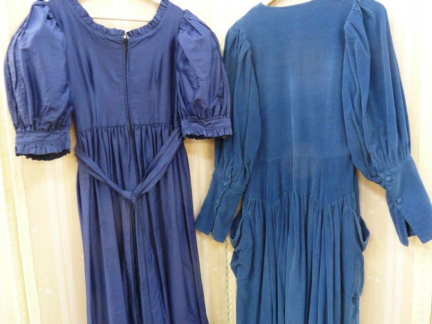 Vintage Laura Ashley , labelled ' Made in Carno, Wales, UK16' maxi dress in blue cotton, pintucked detail to the flounced hem, three-quarter length puff sleeves with pintucks, ruffled neckline and blue tie belt and a Droopy and Browns blue corduroy maxi dress with pockets, button front, collarless, labelled size 14, leg-o-mutton sleeves with two button detail (2)