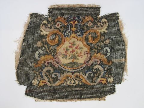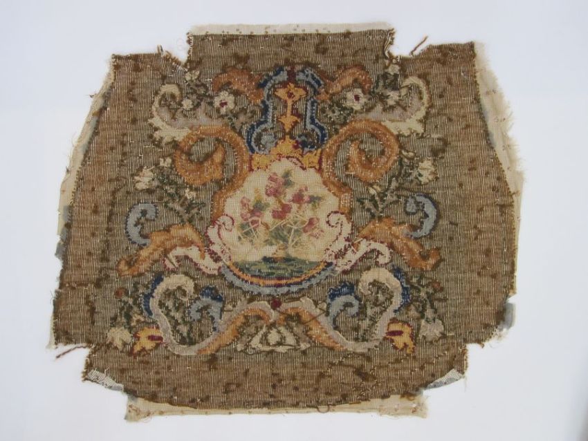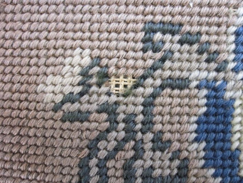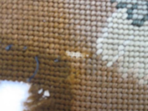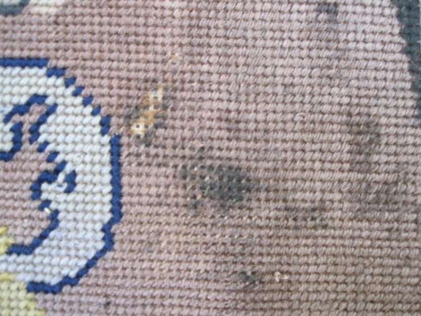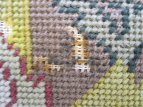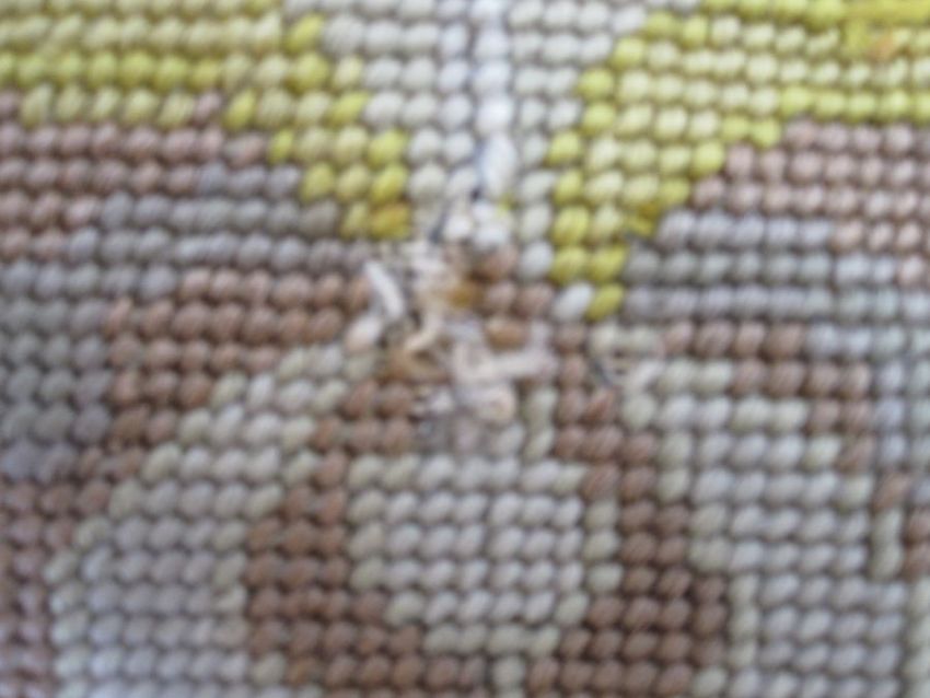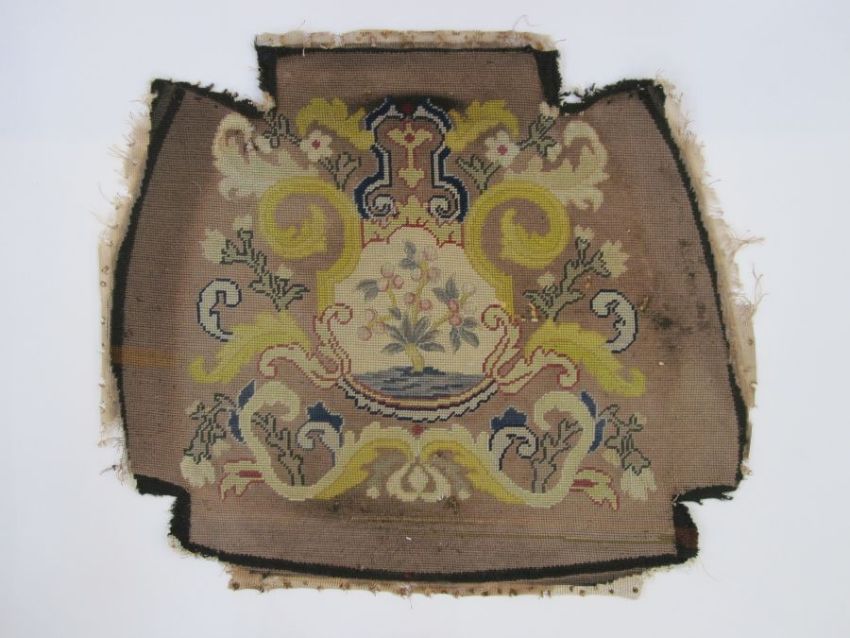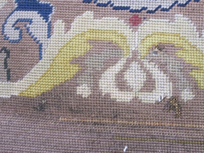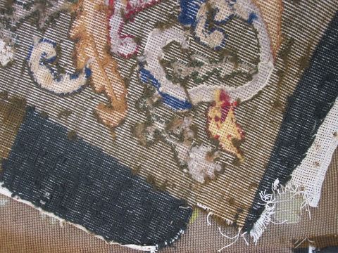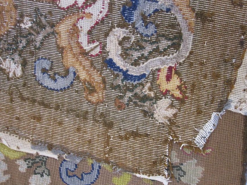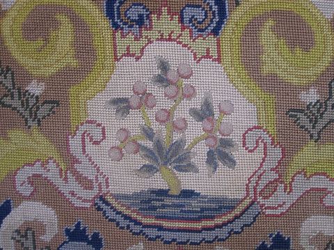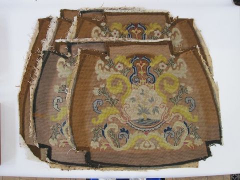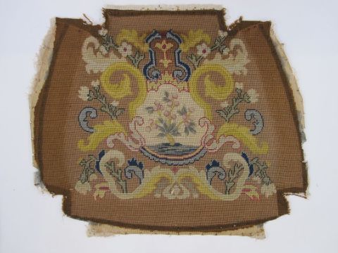 Six antique needlepoint tapestry chair covers with scrolling foliate patterns surrounding a fig tree in yellow, red, blue, green and browns, some use of different coloured wools to background (all faded, minor marks commensurate with age (one particularly marked with several holes and loss of stitching) approx 68 x 58cm.