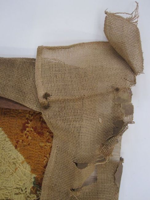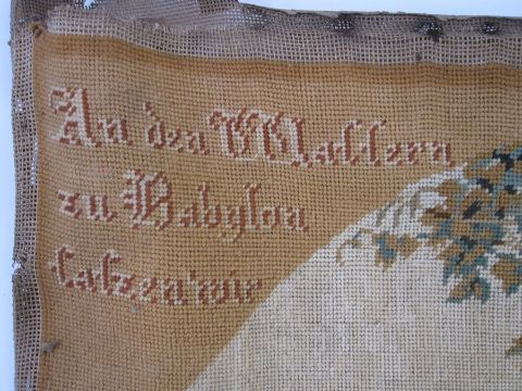 19th century needlepoint embroidery of biblical scene, titles in German gothic script, 'Exile from Babylon' (?) nailed onto a stretcher but the fabric coming away in parts, colours bright, 44 x 58 cms  with an antique seat cover, needlepoint , brown ground with foliate design , 50 x 62 cms approx. ( 2)