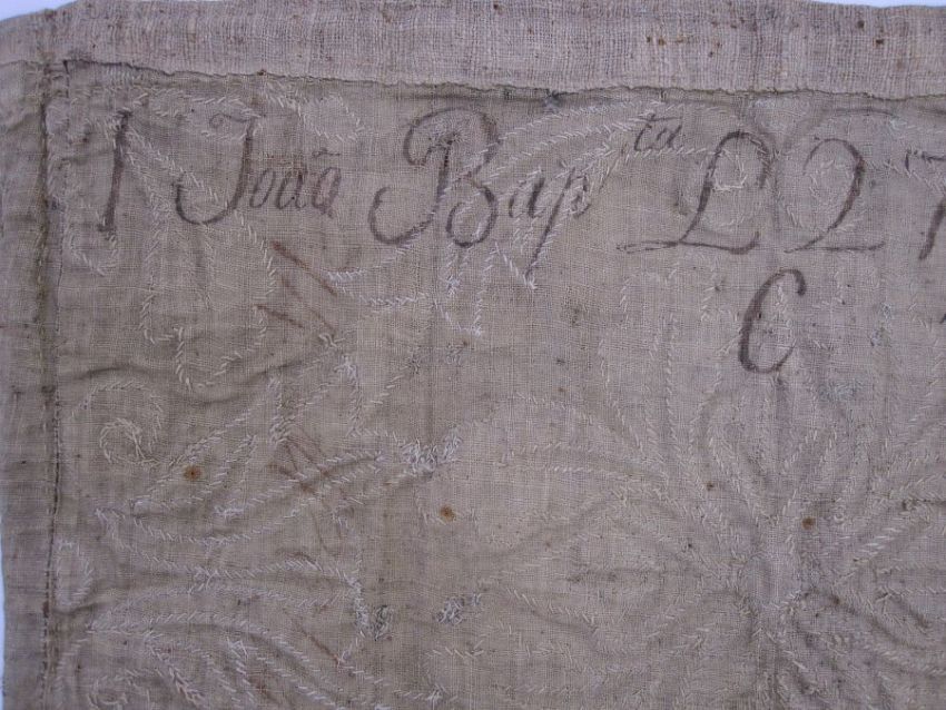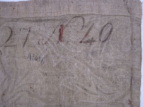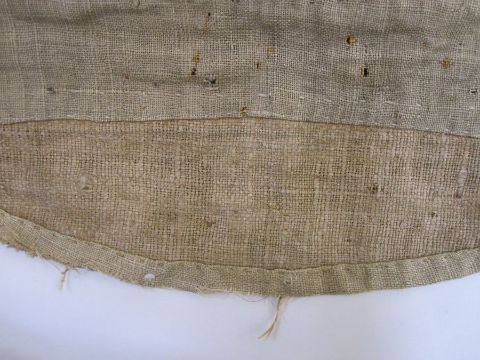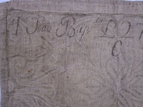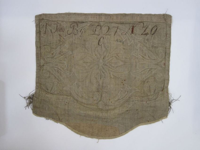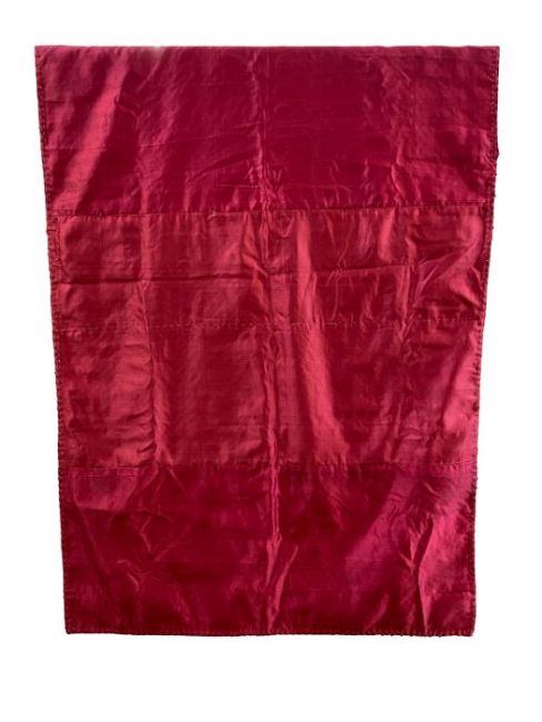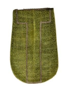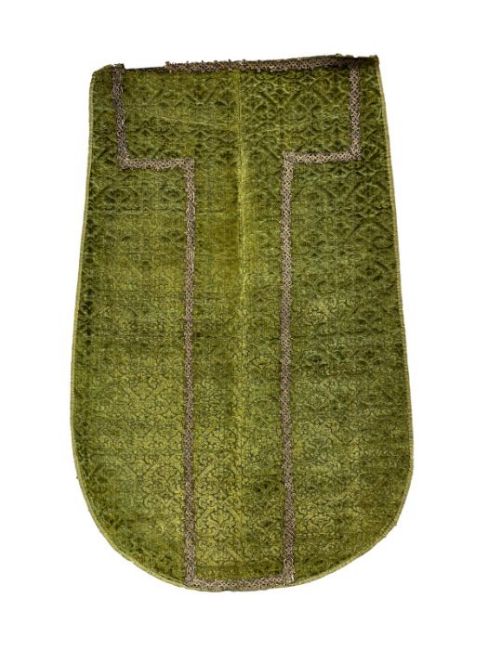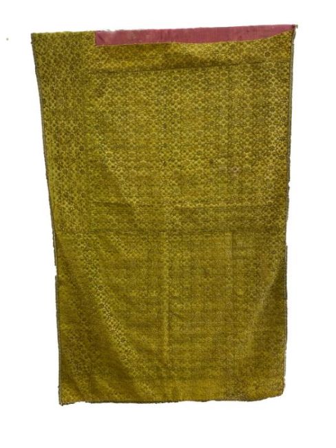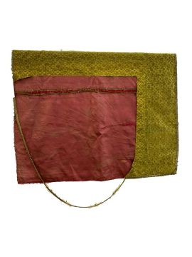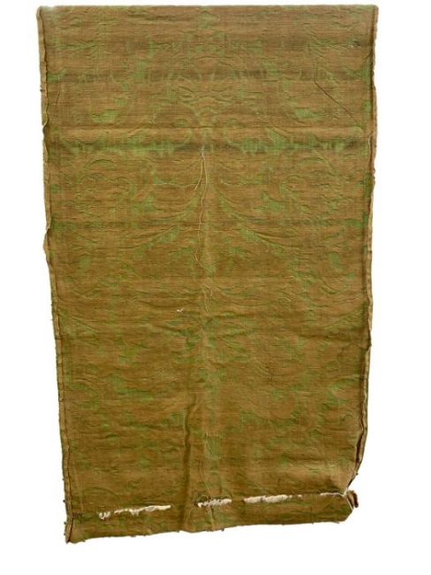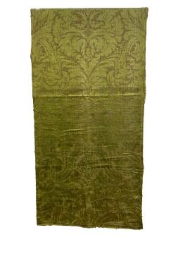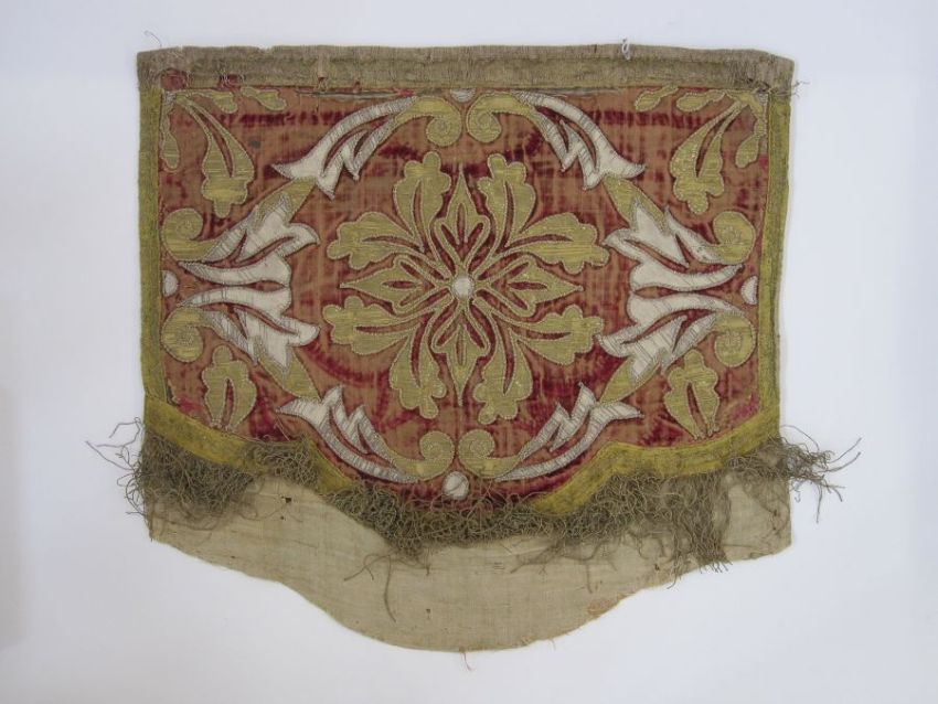 Late eighteenth century red velvet and gold thread-embroidered panel possibly a cope hood, linen-backed, inscribed '' I Joao Bap. ta L27 No. 40, C, A5056'', decorated with scrolling foliate patterns in gilt with tasselled edge, approx 51 x 53cm (velvet and linen worn with some rips, holes and loss of stitching, particularly to edging) together with two antique green and gold velvet/ brocade part-vestment garments, one backed with red silk (piece cut out, approx 63cm x 50cm) and a fragment of 18th century green/gold silk brocade (4)
