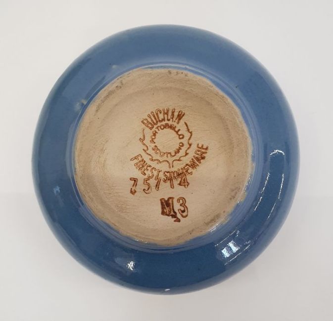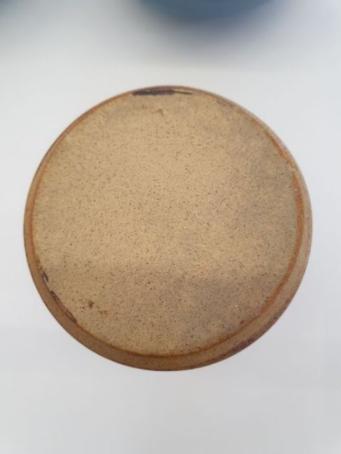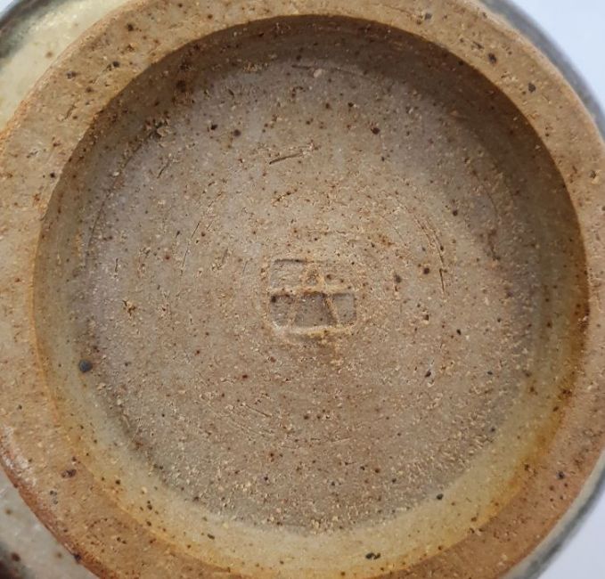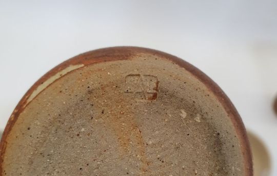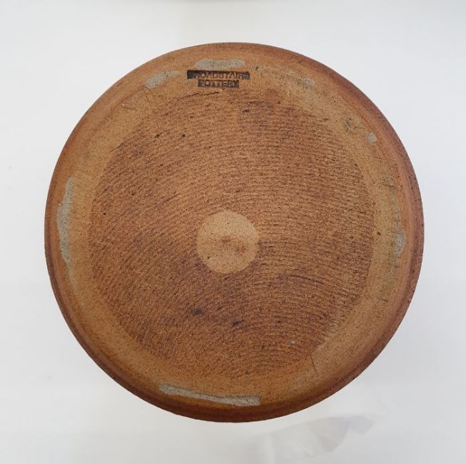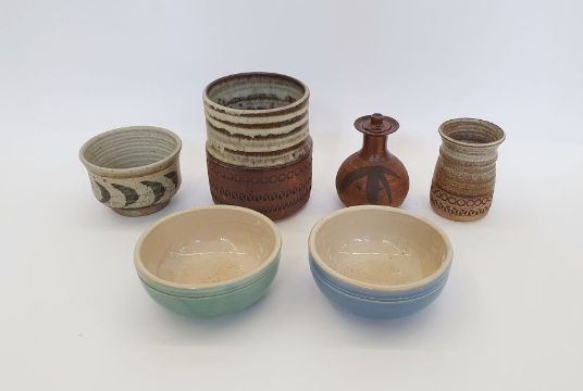 Aller Pottery (Bryan & Julia Newman) studio pottery lidded vessel with red oxide glaze, impressed pottery mark to base (h.11.5cm), an Aller Pottery footed bowl with oxide brushwork decoration on oatmeal glaze, impressed pottery mark to base (h.7cm), a Broadstairs Pottery (David White) cylindrical vase with impressed geometric decoration, impressed pottery mark to base (h.14cm), a Broadstairs Pottery small vase with speckled oatmeal glaze and impressed decoration, impressed pottery mark to base (h.10cm)  and two Buchan pottery bowls (6)