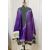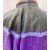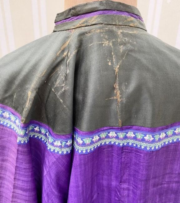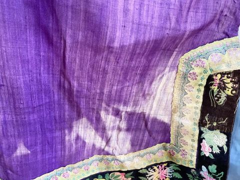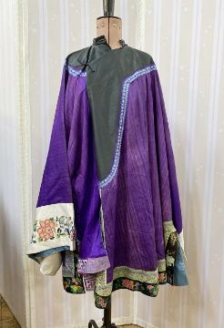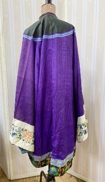 Antique Chinese robe in purple with a turquoise lining and dark green band, deep sleeves with cream cuffs, embroidered with chrysanthemums, embroidered hem, this has possibly been put together