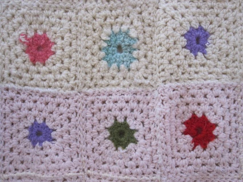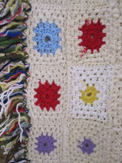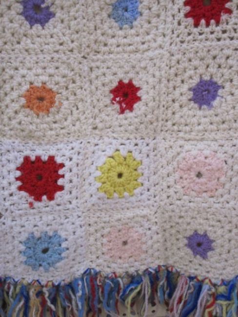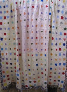 Vintage 1960's - 70's large crocheted blanket, coloured squares with fringe