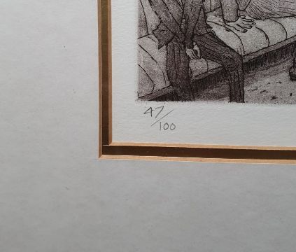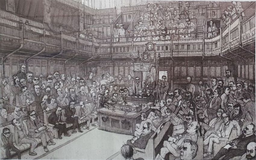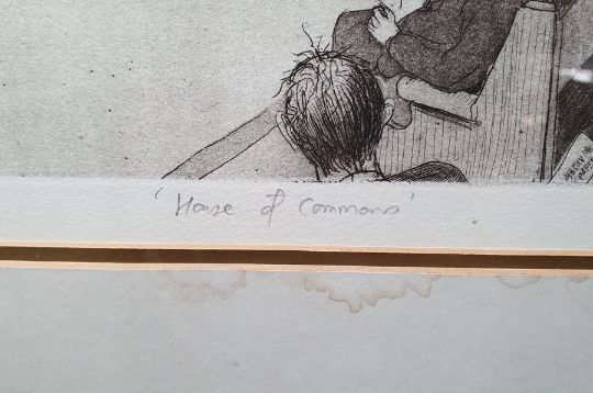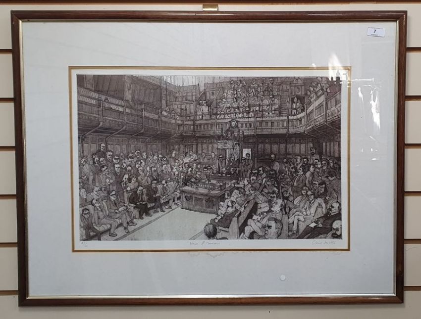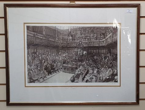 Chris Orr MBE RA (b.1943)Etching and aquatint"House of Commons", signed, titled and dated 1986, numbered 47/100 within margin, framed and glazed, 37cm x 56cm retains the original purchase receipt from the Royal Academy of Arts Summer Exhibition 1987 with a signed personalised letter thanking the purchaser, dated June 16th 1987