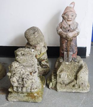 Four composite stone garden ornaments to include a gnome, a mill, a seated hedgehog and one further (4)