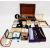 Mahogany writing box enclosing assorted costume jewellery, gold coloured chains, modern bracelets and various costume jewellery in jewellery boxes