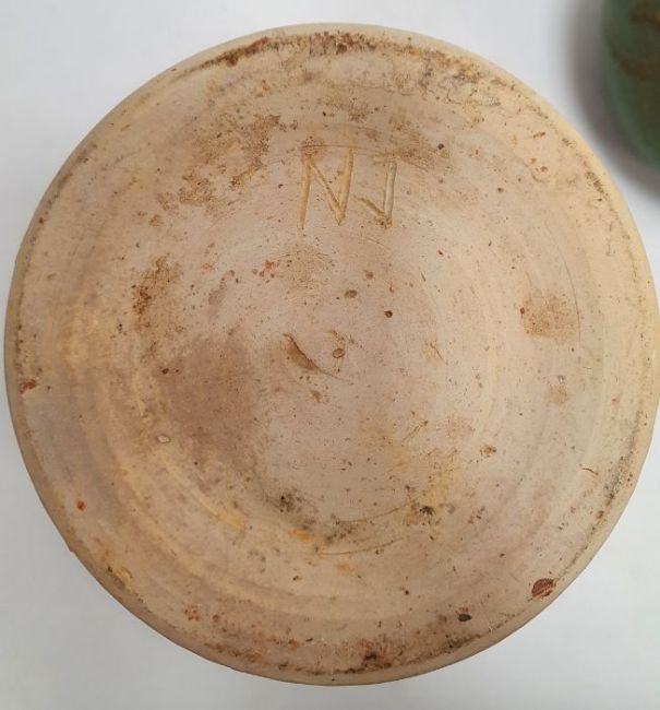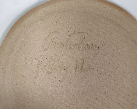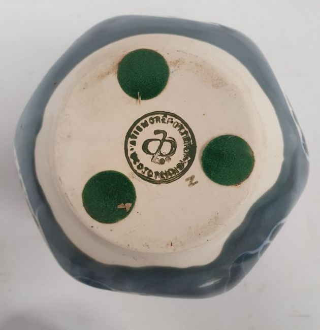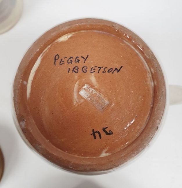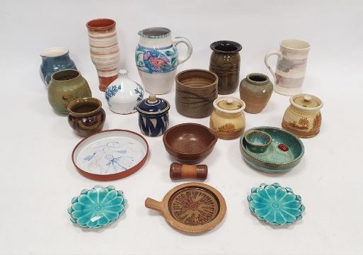 Peggy Ibbotson studio pottery pitcher with floral decoration on white ground 20cm, a pair of Rupert Andrews "Mocha" ware lidded preserve jars 9cm, a David Winkley Vellow Pottery handled dish, a Paul McGrath & Graham Fielder studio pottery vase 10.5cm, a Canterbury Pottery sectioned dish, an Aviemore Scotland pottery vase 13cm, a Rookes Pottery, Ipstone studio pottery vase 8cm, a studio pottery blue and white floral decorated vase signed "SMH '79", a studio pottery pestle & mortar signed "R", together with further assorted studio pottery vases and dishes and a collection of studio and art pottery including 1960's West German (Carstens Tonneshof) vase decorated with terracotta and green bands and trailed stylised V-shaped enamels, 21.5cm high, an Arthur Wood piggy bank painted with orange flowers, a Troika-style rectangular-section vase impressed with stylised leaves on a cream ground, a ribbed barrel-shaped green glazed vase marked 'FT', a green and brown glazed pottery jug modelled as a man with stylised foliate motifs and other items