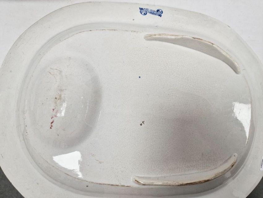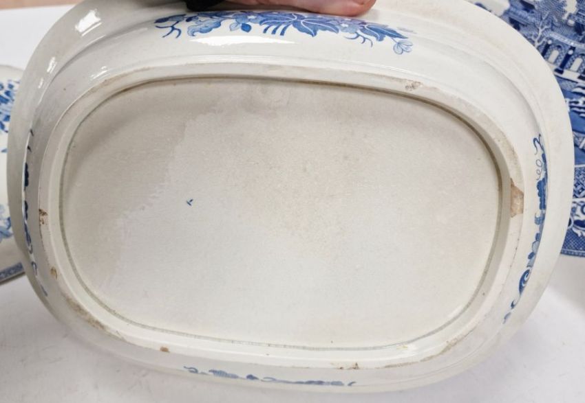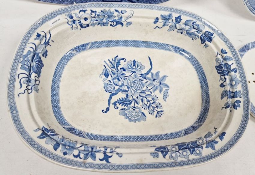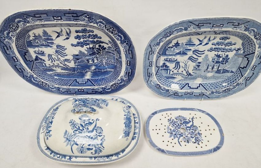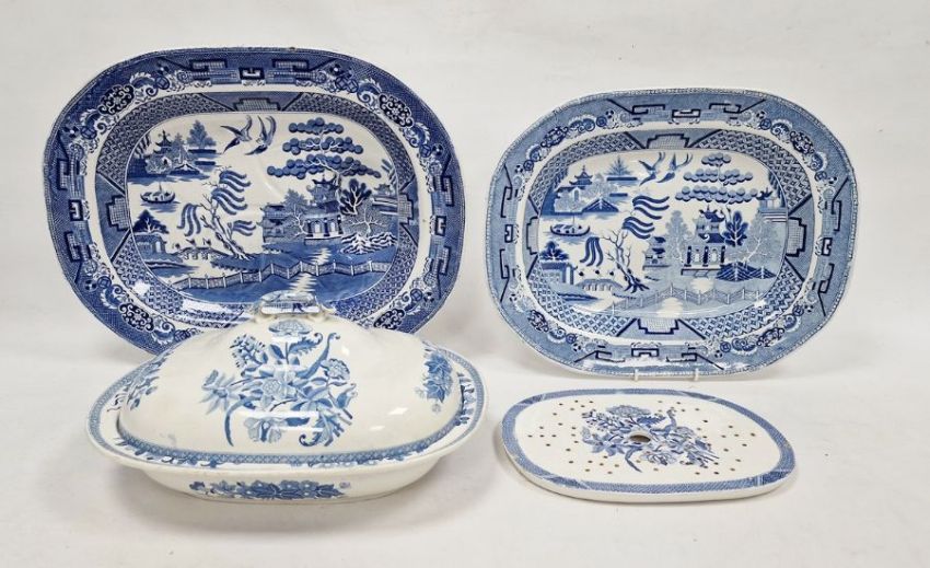 Assorted blue and white meat plates and tureens to include willow meat plate, Staffordshire, willow pattern serving plate, blue and white tureen with floral decoration, two fish serving plates, Spode drainer