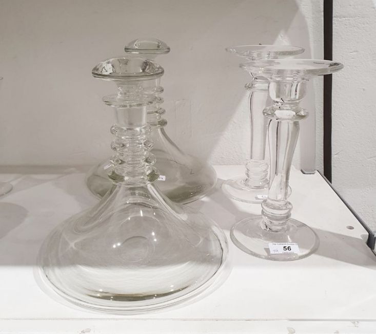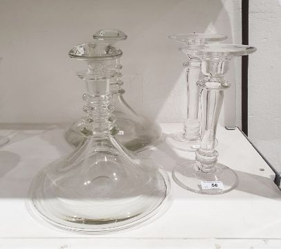 Pair of 20th century ship's decanters and a pair of clear glass candle holders (4)