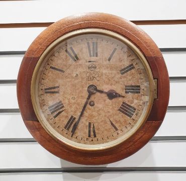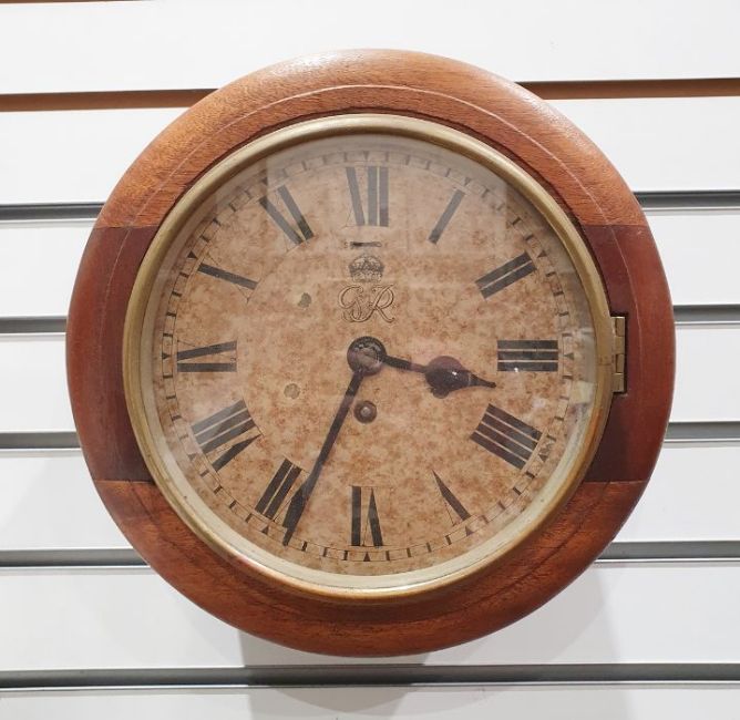 Oak cased circular wall clock, the painted dial with Roman numerals marked 'G VI R' with crown, balance wheel escapement movement, dial 19cm diameter