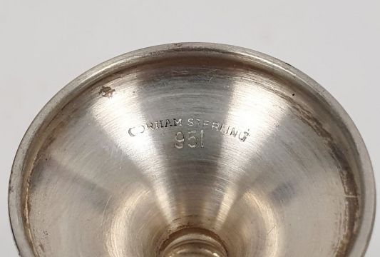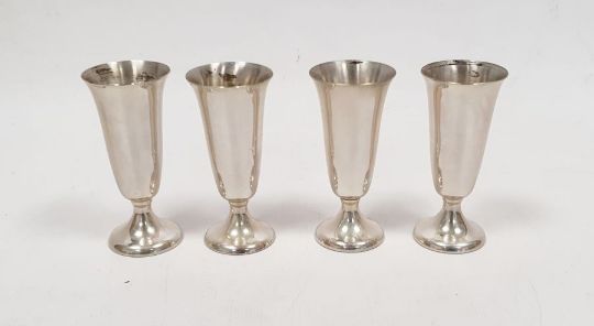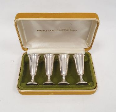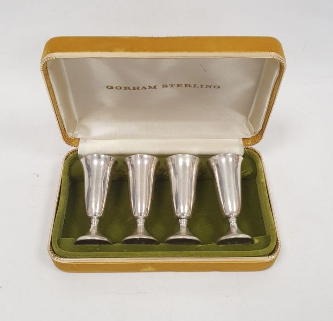 Cased set of four Gorham American sterling shot glasses, each 7cm high approx. and each 0.6ozt approx., in fitted case