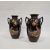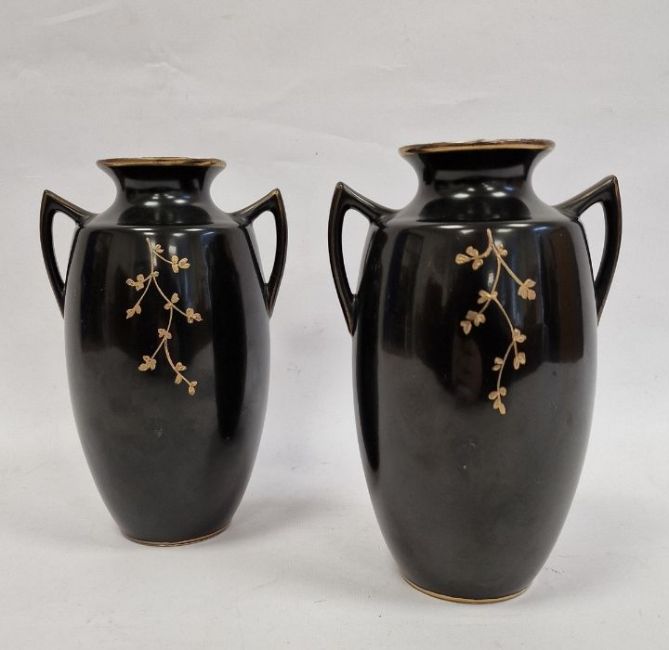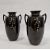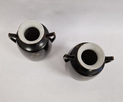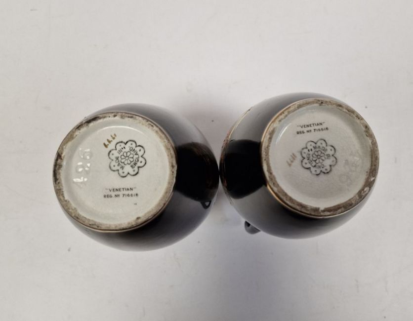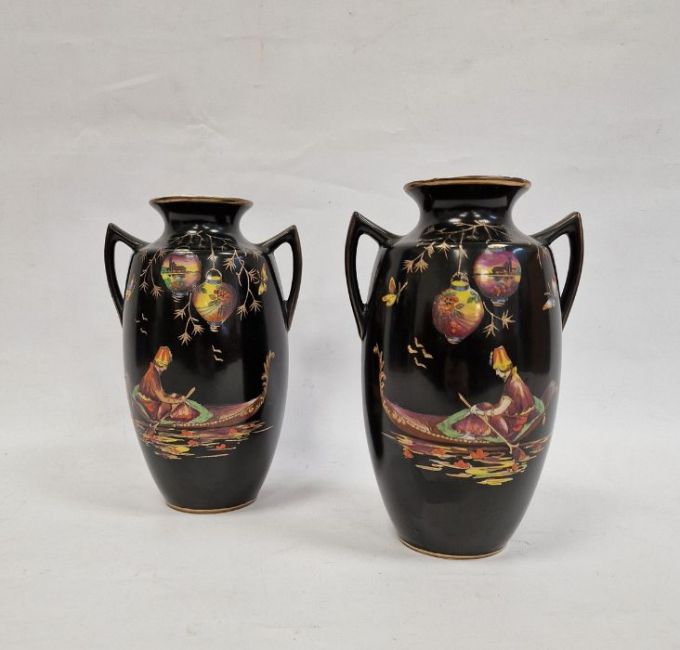 Pair 20th century pottery vases, ovoid and two handled, black ground and decorated with figures in gondolas, 22cm high