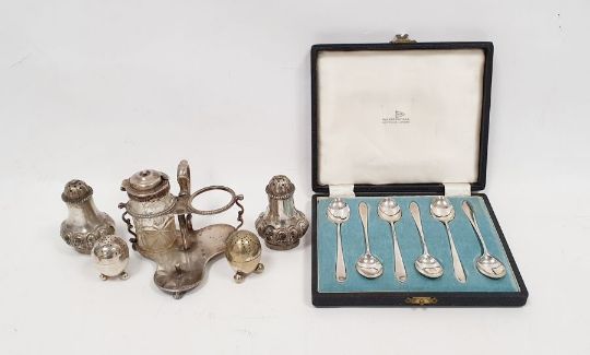 Cased set of six 1950's Walker & Hall silver teaspoons, Sheffield 1958, 2ozt total approx., a pair of early 20th century silver pepperettes, Birmingham 1904, 1.5ozt total approx., an early 20th century silver pepperette, egg-shaped, Birmingham 1911 and another similar silver-plated, a Victorian silver cruet stand with one silver lidded and glass pot (others missing), London 1958, makers Charles Thomas Fox and George Fox, the stand 3oz approx.