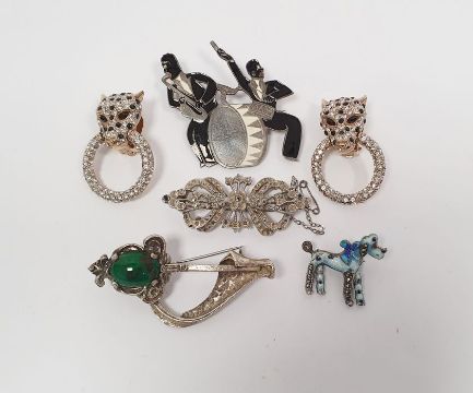 Pair of Butler & Wilson leopard clip-on earrings, a silver-coloured metal and blue enamel poodle brooch, two other brooches and a Miracle brooch (5)