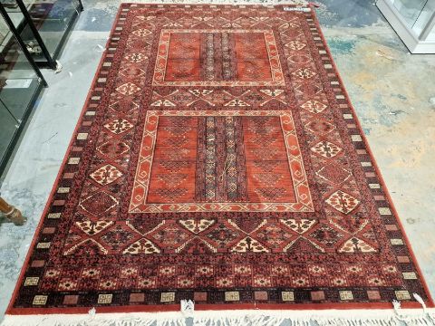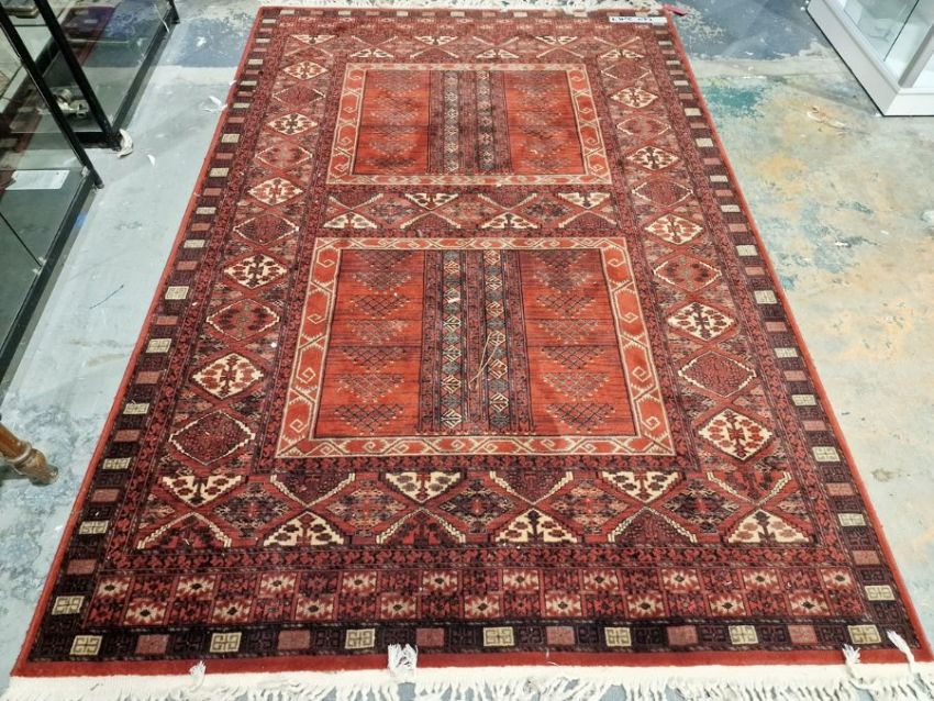 Modern Royal Keshan red ground wool pile carpet with central duplicated rectangular design with multiple geometric borders 294cm X 197cm