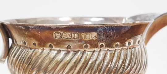 Edwardian silver cream jug, cylindrical, footed and semi-gadrooned, Sheffield 1903, 9cm high