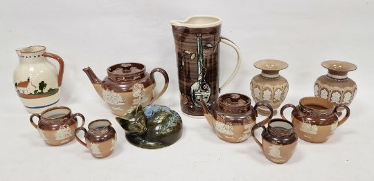 Royal Doulton stoneware teapot and various Doulton stoneware teapots and jugs, a pair of Doulton Silicon Lambeth vases, an Australian studios Zalmen model of sleeping cat and a jug signed to base