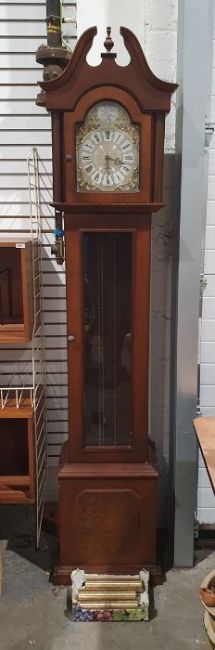 Modern longcase clock in mahogany case, Roman numerals to the dial, marked 'Westminster, Germany', with chiming mechanismCondition Reportapprox 213cm tall