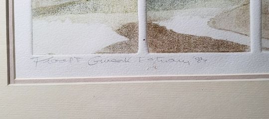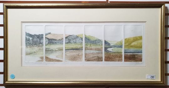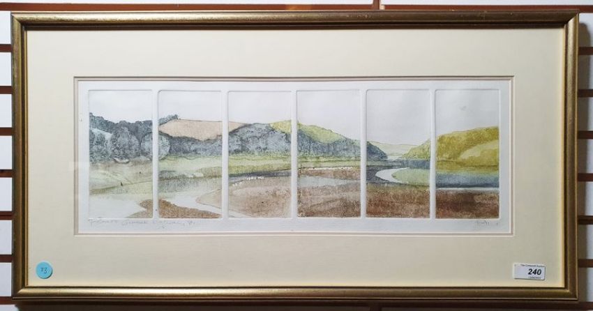 20th century school Lithographic studyEstuary scene, indistinctly titled and dated 87 lower left, indistinctly initialled lower right, 14.5cm x 47cm