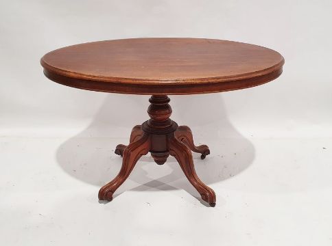 Early 20th century mahogany oval tilt-top loo table on turned pedestal, quadruped base, height 72cm, length 116cm, width 82cm