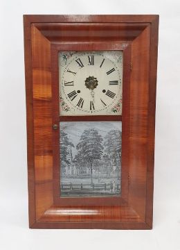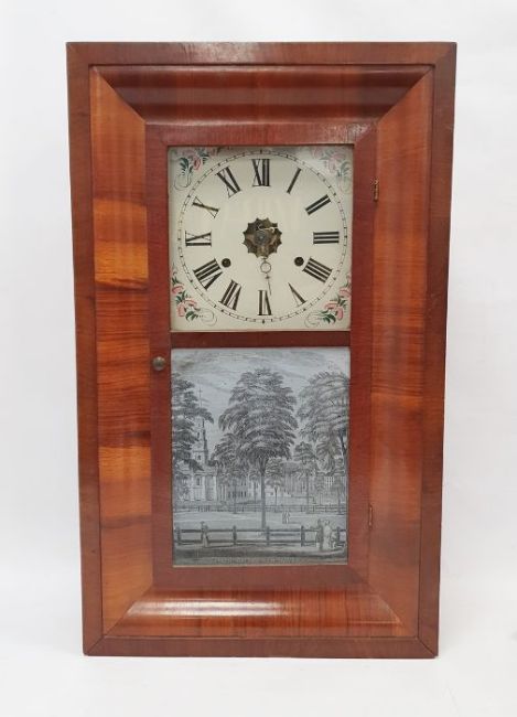 American 36-hour weight-driven wall clock by Seth Thomas, Conn., the square painted dial with Roman numerals, in two-glass mahogany case, the lower with greyscale image of Public Square, New Haven..