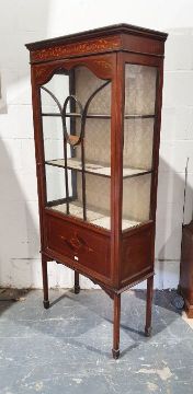 Edwardian display cabinet with ogee moulded pediment above astragal-glazed door enclosing shelves, on square section supports, 170cm x 75cm x 33cm