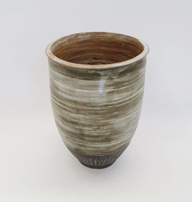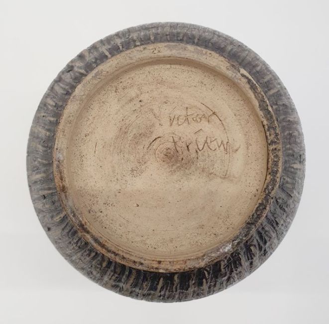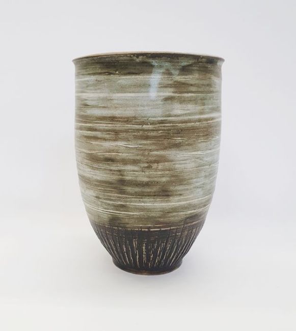 Victor Priem (Latvian 1925-1989) a stoneware vase with mottled green glaze and incised decoration, signed to base (h. 21cm)