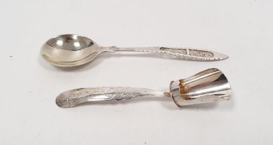 Foreign silver spoon with filigree decorated handle marked '830', 0.5ozt and a silver scoop engraved decoration, marked '835CW'(?), 0.4ozt (2)