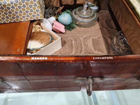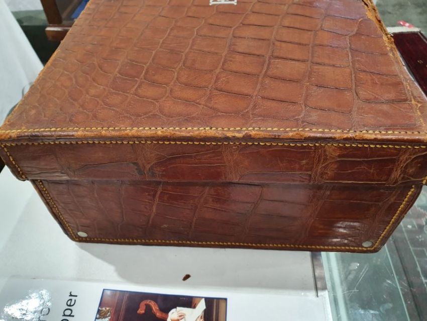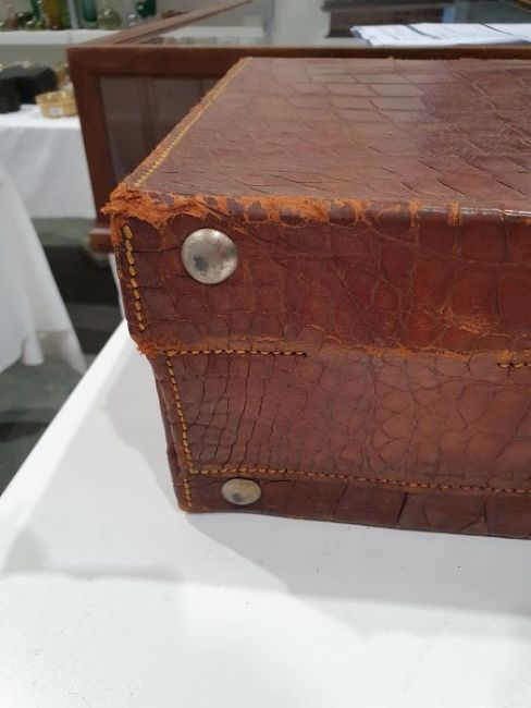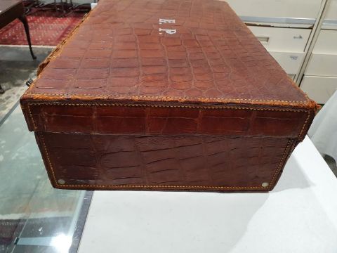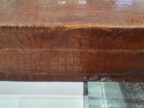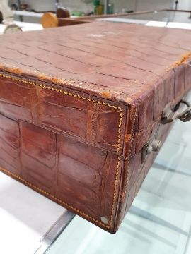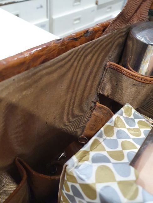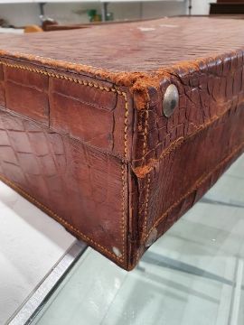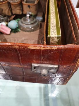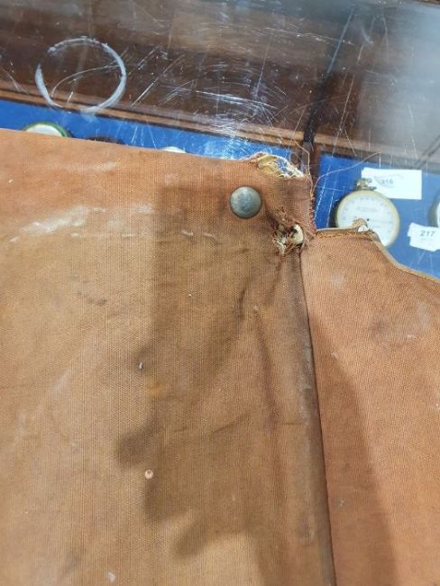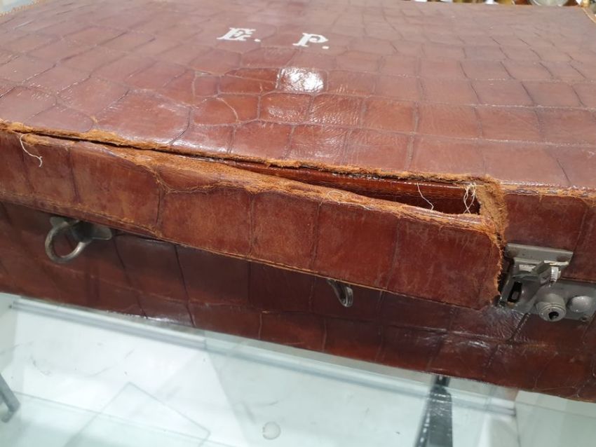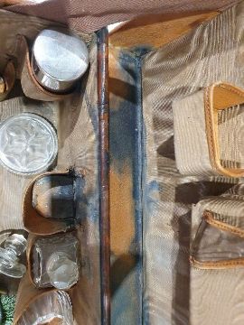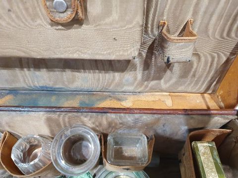 Surface scratches and scuffs, areas of fading and discolouration, split to the front of the lid, staining, loose threads and some tears to the silk lining. Rips and stains to canvas outer.