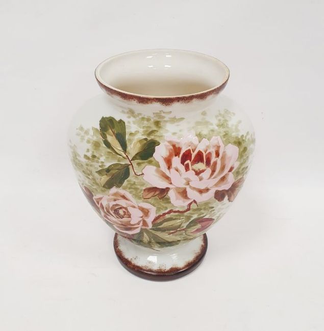 Large Victorian opaline glass vase of flattened baluster form with hand painted pink rose decoration 29.5cm