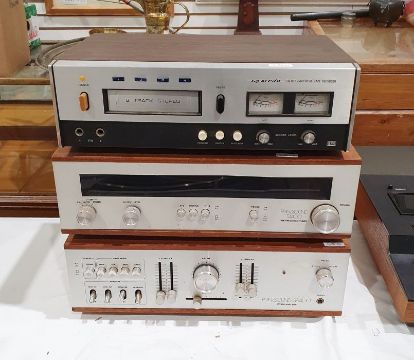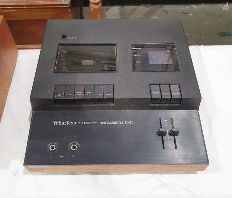 Vintage Wharfedale 20D cassette unit with teak casing, serial no.37198, a vintage Realistic GR-882 8-track stereo record deck, model no.14-944, a vintage Prinzsound T4400 AMFM stereo tuner, serial no.071476 and a vintage Prinzsound SA4001 stereo amplifier, serial no.072149 (4)