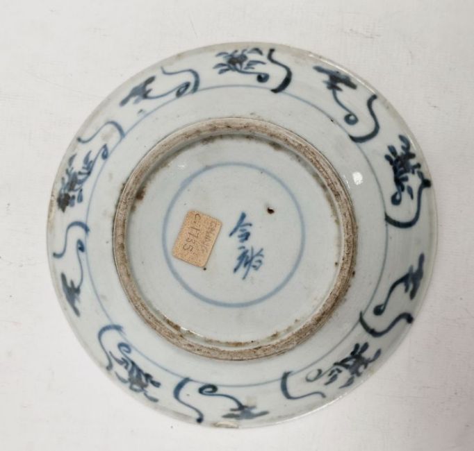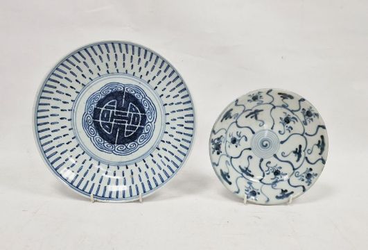 Chinese plate with blue and white scrolled decoration, two-character mark to base, 26cm diam and a further Chinese blue and white plate unmarked to base (2)