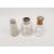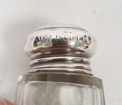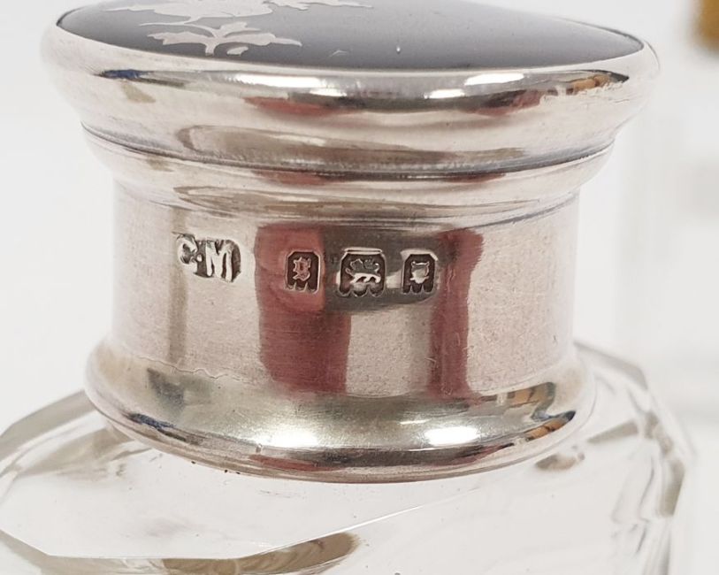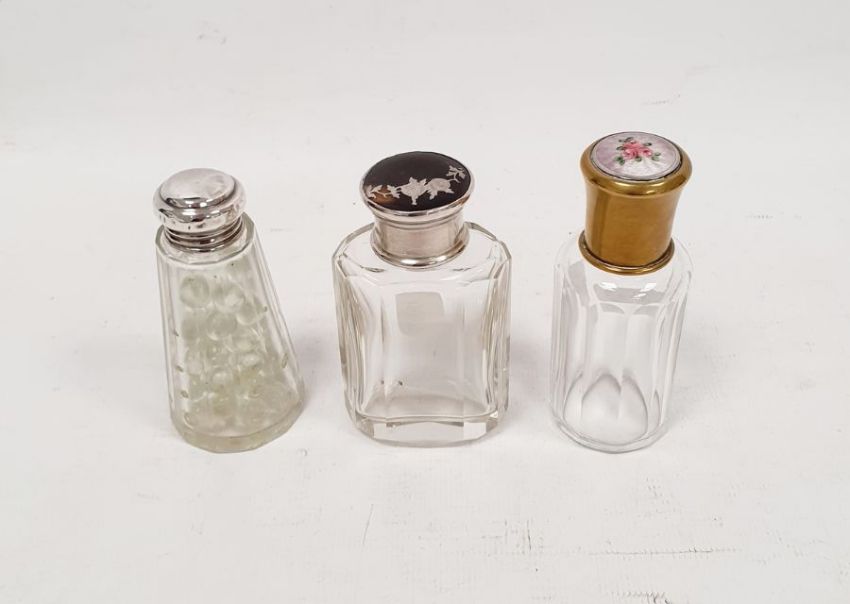 Victorian silver, tortoiseshell and pique work lidded and glass scent bottle, London 1873, maker C.M, a silver lidded scent bottle, marks worn, 7.5cm high and a pink enamel and floral decorated metal lidded scent bottle, 8.5cm high (3)
