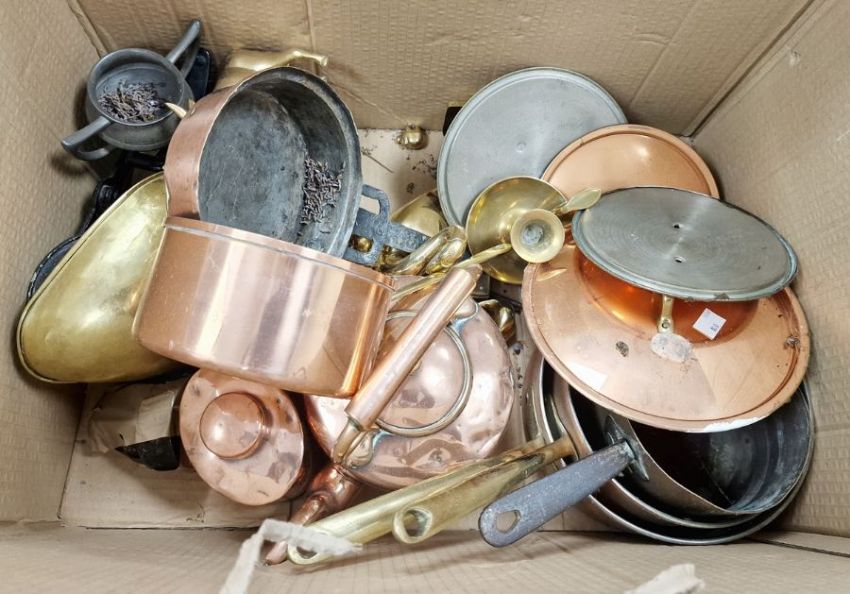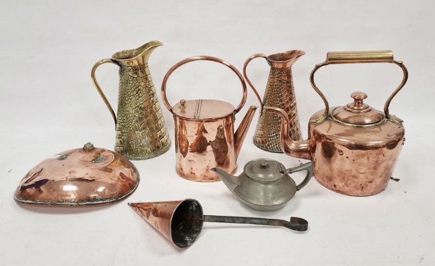 Quantity of brass and copper items to include copper jugs, brass jug, kettles, teapot, pans, candlesticks, etc